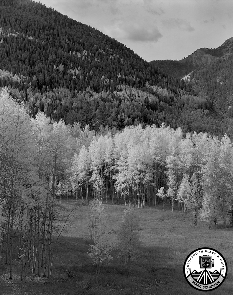 An aspen grove stands brilliantly side-lit in hazy morning sunlight in this scene on Castle Creek and Conundrum Creek Roads where a slope in the Conundrum valley is visible in the distance. Taken with a 600mm f9 ED Nikkor lens on an 8×10 Stenopeika view camera using Kodak film.