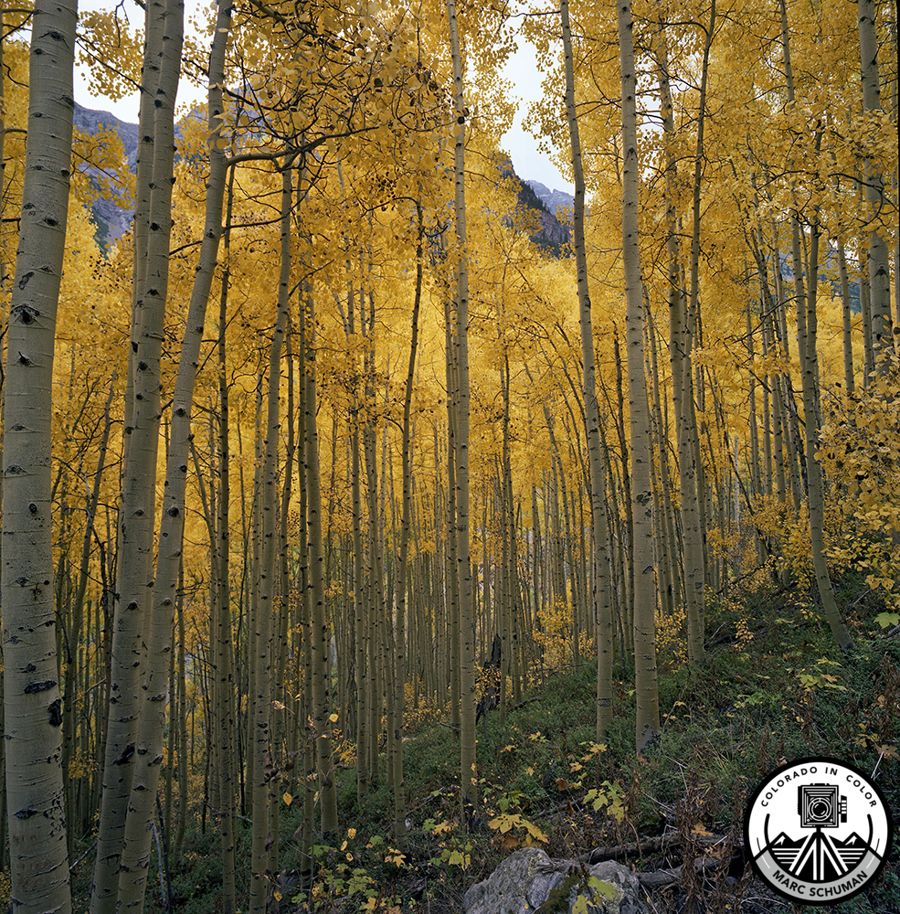 There are two lakes that exist east of the famed Maroon Bells. The far more famous eastern-most Maroon Lake lies at 9500 feet elevation and provides the foreground reflection seen in millions of photographs taken of the Maroon Bells. To the west of Maroon Lake up a 1.8-mile steep rocky trail lies Crater Lake on a bench at 10,000 feet that is situated much closer to the base of the famous Maroon Peaks. Maroon Lake provides far more pleasing reflections of its namesake peaks, as Crater Lake is so close to the foot of the Maroon Bells that their dramatic grandeur cannot be fully appreciated from the nearer position. Nonetheless, the hike to Crater Lake offers awesome views of Pyramid Peak to the south of the Maroon Bells. At the beginning of the Crater Lake trail is the infamous “Deadly Bells” warning sign to all would-be hikers and climbers contemplating an ascent to either one or both of the Maroon Peaks. Slippery, unstable, maroon-colored skree and shale of which these peaks are composed has contributed to the death of many who’ve attempted the ascent of these 14,000 foot peaks. Sudden summer thunderstorms have caught many unprepared for the challenges presented by these unforgiving mountains. During my ascent of the Crater Lake trail in the fall of 1976, laden with two medium format Hasselblad cameras and an assortment of lenses, I witnessed the weather change from a splendid sunny day to overcast conditions seen in this image with a glimpse through the trees of the ridgeline of Pyramid Peak. The canopy of stately aspens on this rocky trail is mesmerizing and ever-changing. Of all the aspen forests I’ve experienced in Colorado, this one has no equal because of the towering maroon peaks that can be seen as one climbs through this rich unworldly display of yellow autumn hues. This image was originally captured on 70mm Kodak color negative film using a Hasselblad Superwide camera equipped with the Carl Zeiss 38mm f4.5 Biogon lens. A high-resolution digital scan was made of the negative that will yield extremely high quality color prints.