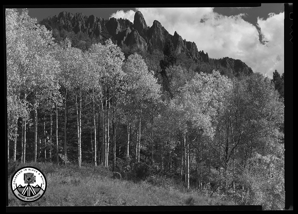 Aspens at peak fall brilliance mirror the grandeur of pinnacles in the San Juan Mountains near Telluride, Colorado. Paralleling the San Miguel River, Illium Road offers dramatic views of nearby mountains in the San Juan range. Taken with a 450mm f9 Nikkor lens on a Stenopeika 5×7 view camera on Kodak Film.