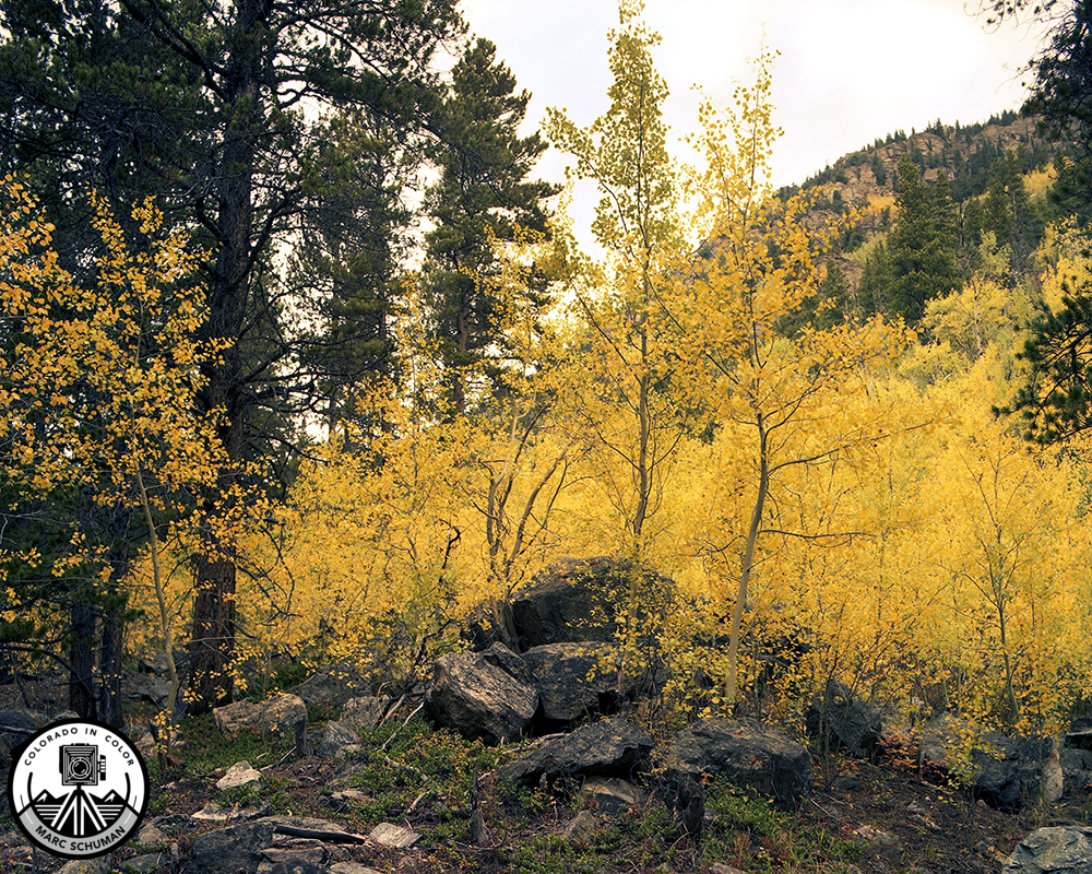 Not all fall beauty in Colorado lies in tall slender aspen groves and vast hillsides of yellow. The subtleties of smaller undergrowth that normally go unnoticed during much of the year suddenly garner the attention of those willing to stop and appreciate these areas. Here along the steep Crater Lake trail, tiny saplings find a way to thrive among the endless piles of fallen rock that were once part of the surrounding mountains. Image captured on 70mm Kodak color negative film using a Hasselblad 500C medium format camera fitted with an 80mm f2.8 Carl Zeiss Planar lens.