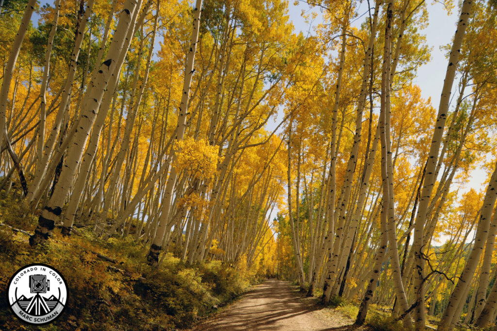 Taken with a 24mm f3.5 Perspective Control Lens on a Nikon D700, Aspens are at peak on the Last Dollar Road on the very day of the autumnal equinox in 2012. This view of the road going through a towering grove of aspens represents many stretches of this old mining trail from Highway 62 at the north end to the Telluride Airport on the south end at Highway 145. The Perspective Control Lens was used to avoid the convergence of the trees in this grove, though most were leaning to the viewer’s right. The shallow rooted aspens frequently lean on steep slopes.