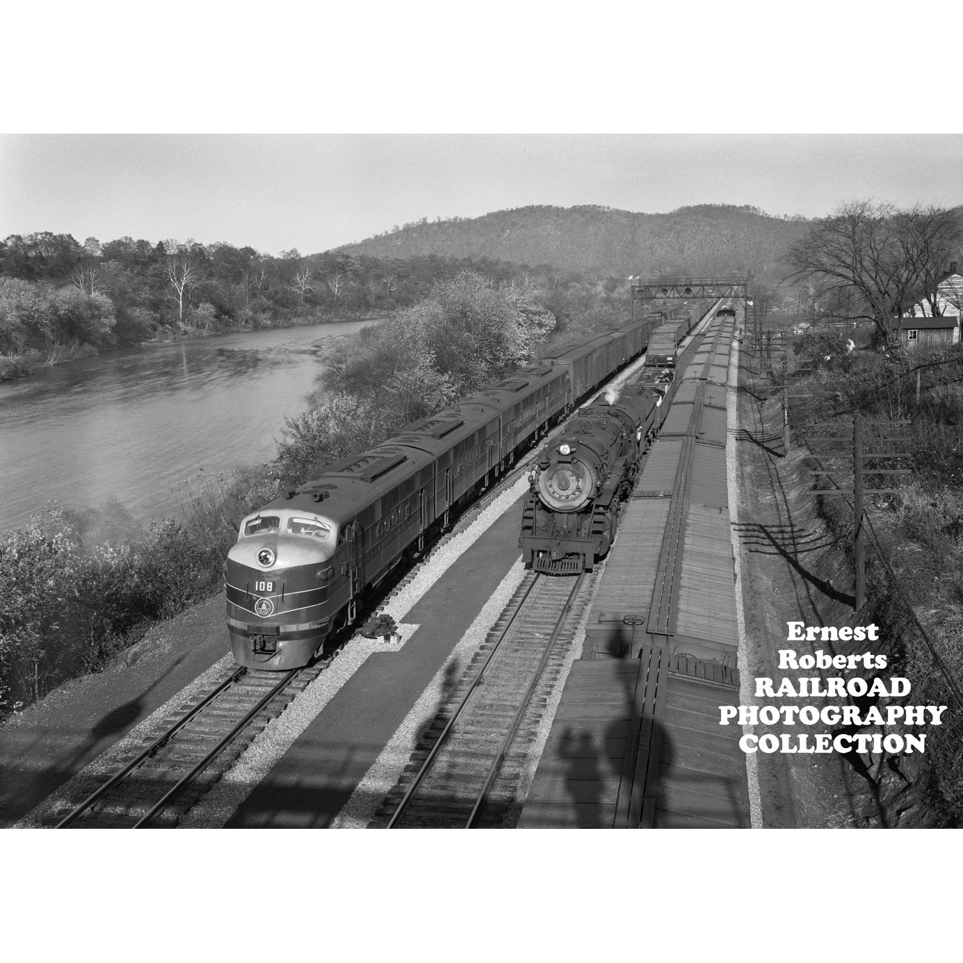 A Baltimore and Ohio Railroad freight engine technology contrast–#108 Diesel A-B-B-A configuration freight drag on left and an unidentified steam locomotive freight consist on right pose together for a company photographer at the small West Virginia hamlet of Sir John’s Run on the Potomac River in Morgan County.