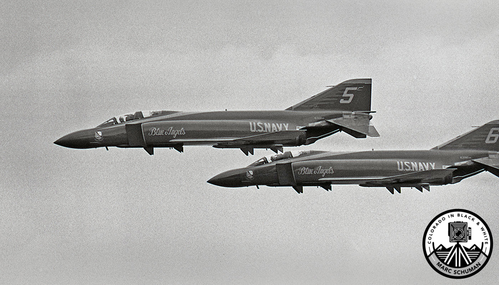 F4 Phantom solo planes numbers five and six are seen here over the Purdue University campus in a May 1969 air show. Nearly sixty years ago F4’s were the front-line supersonic interceptor/fighter/bombers of the US Navy. Eventually used by the Marine Corps and Air Force as well, more than five thousand of these venerable aircraft were produced. No other American jet fighter has been produced in such large numbers. Image was made with a Yashica J-5 SLR fitted with a manual focus Yashinon 75-230mm f4.5 Zoom lens at 230mm using Kodak black and white film. Due to their high prices motor-driven 35mm SLR’s were the tools of professional photographers in 1969, and their firing rates were just two to four frames per second–primitive compared to today’s mirrorless cameras and professional DSLR’s. Auto-focus lenses were fifteen years into the future. Of the images made that day on a single thirty-six exposure roll of film, only one or two frames were successful.