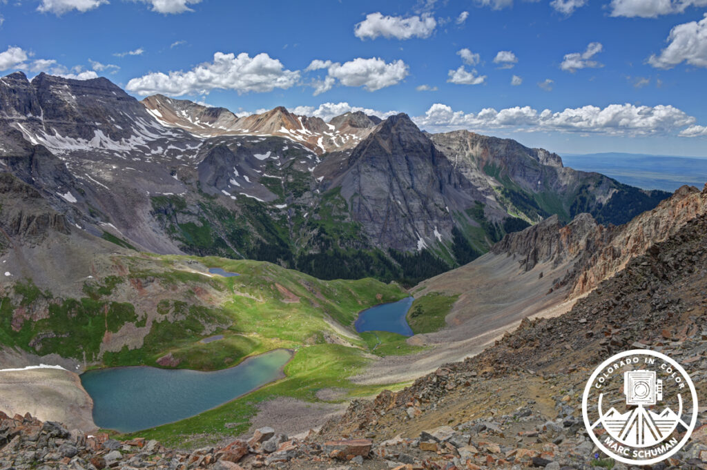 The Blue Lakes are one of the more spectacular scenes in Ouray County, Colorado, nestled in the high mountains near Mt. Sneffels. In this photograph at upper right is a tiny sliver of the view towards the Uncompahgre Plateau, which lies north of the San Juan Mountains. Taken with a Nikon D810 equipped with a 24-70mm f2.8 ED Nikkor Zoom Lens at 27mm.