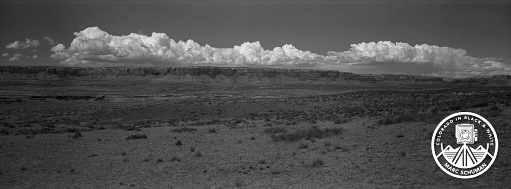 Bluffs and Cumulus Clouds–Panorama, U.S. Hwy 191 South of Bluff, Utah, March 26, 2025