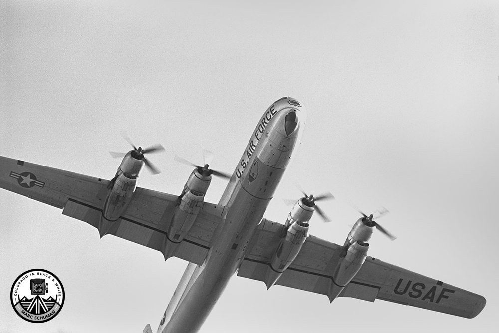 C-97’s were an outgrowth of the Boeing B-29 and B-50 airframes and served as the standard heavy lift aircraft in the post WWII era through the late 1960’s, eventually replaced by the C-124 Globemaster. The KC-97 version of this airframe served as the first in-flight refueling aircraft for the U.S. Air Force, eventually replaced by the Boeing KC-135 jet powered tanker designed on the 707 airframe. Seen here shortly after takeoff, this image was captured with a Yashica J-5 SLR using a 75-230mm f4.5 Yashinon zoom lens on Kodak film.