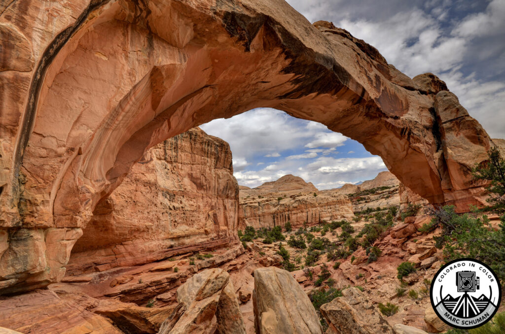 Taken with a Nikon D-850 equipped with a Nikkor 16-35mm f4 VR wide angle zoom lens, this view shows the full 133 foot span of the bridge over the Fremont River framing the valley leading up to the bridge.