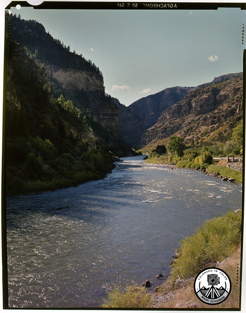 Looking west from my vantage point on the north bank of the Colorado River, the Grizzly Creek rest stop is visible at right center of the frame with its monument to the California Zephyr set on twin rock pylons. Eighteen years later the old Grizzly Creek Bridge and the Zephyr monument were long gone, replaced by the graceful, elevated lanes of Interstate 70. To capture this photograph today, one would have to walk or bike to this position on the bike path which runs between I-70 and the Colorado River. At the time I made this large format photograph, it was only necessary to park my vehicle on the shoulder of the old US Hiway 6, set up a tripod and my 4×5 Calumet view camera equipped with a 150mm Schneider Symmar lens and make the image on color transparency film seen here. The transparency was digitized directly on the scanner glass without a carrier to minimize dust and maximize sharpness. Clip marks from the film hanger during processing are visible on the right edge of the film. Due to the slight curvature of the film, the image bows outward but is easily corrected in printing.