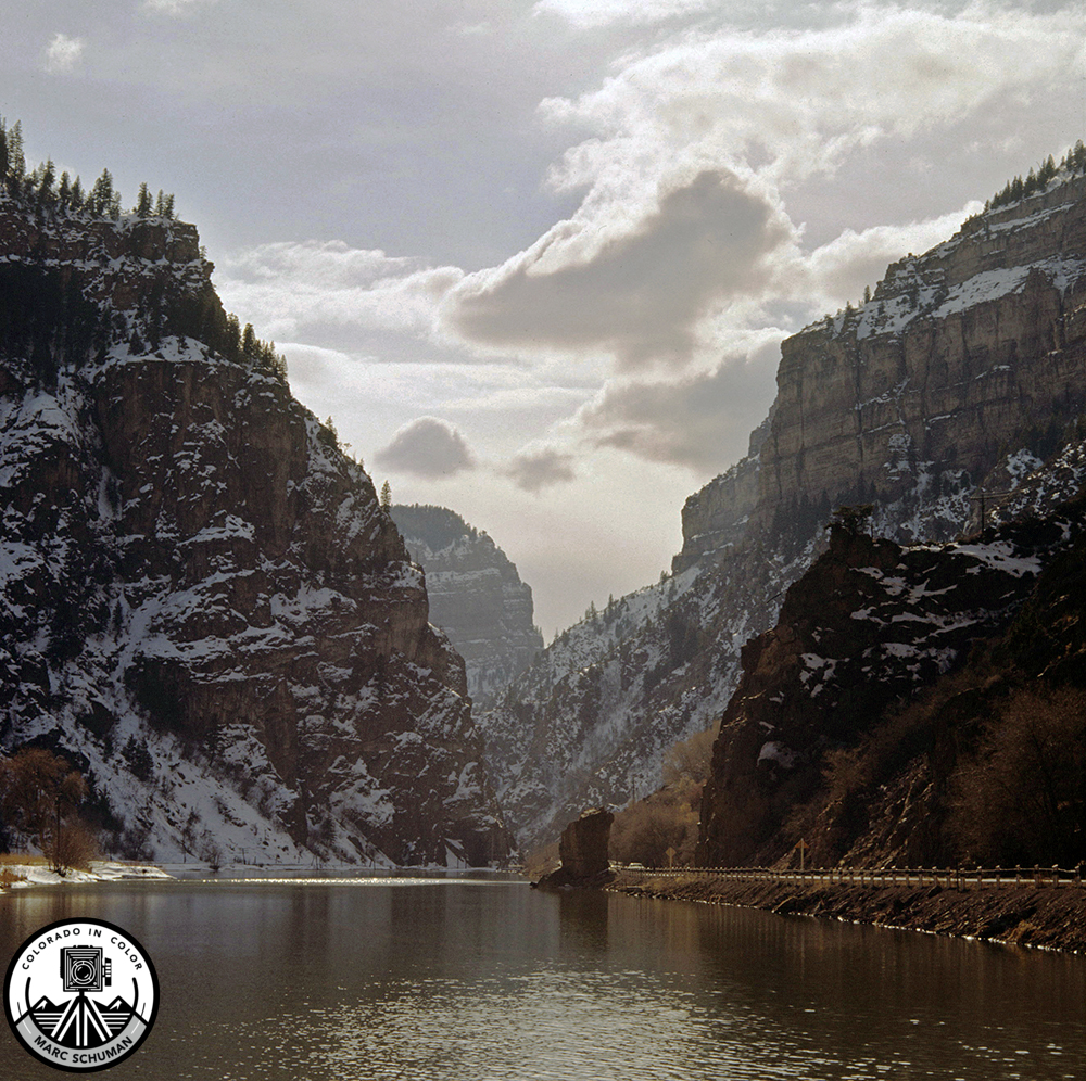 Looking west from the Hanging Lake area on a late winter afternoon with a blue sky and back lit clouds, this scene of the Colorado River and old Hiway 6 does not exist today. The elevated interstate highway that now traverses Glenwood Canyon, dominates this once peaceful natural view just east and up-river of the Shoshone Dam. Taken with an 80mm Carl Zeiss Planar lens on a Hasselblad 500C using Kodak transparency film, this image was digitally scanned and will produce high quality inkjet prints