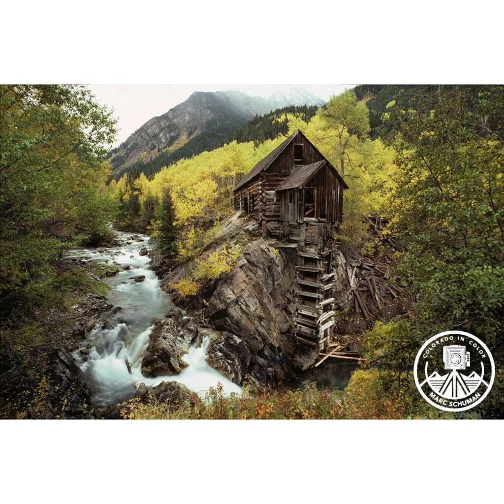 Taken at the height of fall colors on a misty fall day the Crystal Mill sits on its rocky perch as the Crystal River rushes past. There may be no more photographed structure in all of Colorado than this iconic mill, which is not a mill at all, but an abandoned powerhouse. In this image, the roof is in disrepair, showing its weathered patina. In succeeding years, the roof was replaced more than once with new wood that contrasted sharply with the rest of the structure, detracting from the appearance seen in this image.