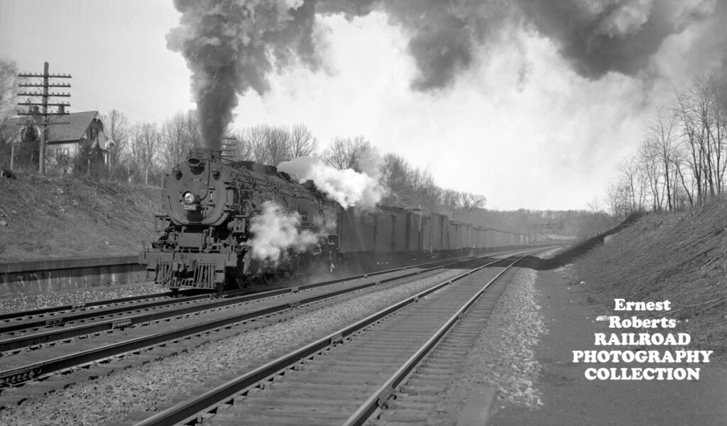 An excellent photograph of what is either a 4-8-2 “Mountain” or a 4-8-4 “Northern” Steam Engine under full steam pulling a long consist of boxcars and gondolas as far as the eye can see demonstrates the advanced development of the railroad industry in the U.S. in the months before this country’s involvement in WWII, already being fought in Europe and the Far East.  After the Pearl Harbor attack, America’s vast railroad infrastructure allowed the rapid movement of war materiel and troops anywhere in the country within a few days.