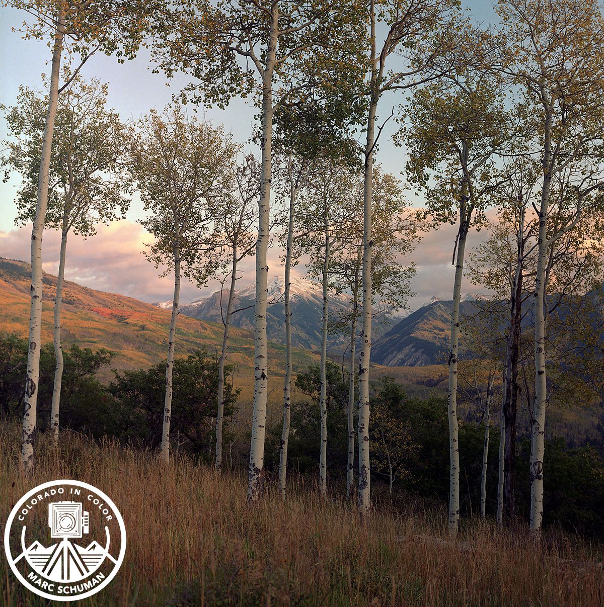 A scene of subtle fall hues taken at dusk with a Hasselblad 500 CM equipped with a 60mm f3.5 Carl Zeiss Distagon lens on Kodak film, the Elk Mountains to the east have already been dusted with early season snow.