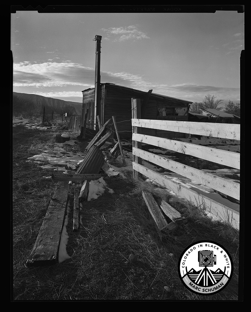 Emma, Colorado, lies between Basalt and Carbondale on State Highway 82 in the Roaring Fork River Valley in Western Colorado. Emma is just a place name.  There is no town. However, a handsome abandoned red brick building stands in Emma close to the highway that served as a general store decades before my arrival in 1971.  Next to the brick building was a small farmyard that caught my eye in the late October afternoon sun.  Typical at the time were small farms up and down the Roaring Fork Valley that had been started by European immigrant families.  I had no idea who owned this farm, but the strong lines in this scene grabbed my attention, and I took the time to make this photograph on Kodak film with my 4×5 Calumet view camera equipped with a Schneider 90mm f8 Super Angulon wide angle lens.  Strong compositional lines–a tall bird house, a rough sawn fence, an old barn, discarded lumber, corrugated sheet metal, among many other elements, all suggested a story of earlier times that descended to this scene of disrepair.  Today the mid-Roaring Fork Valley bustles with development and gentrification, having long since swept away scenes such as this that captivated my interest more than fifty years ago.