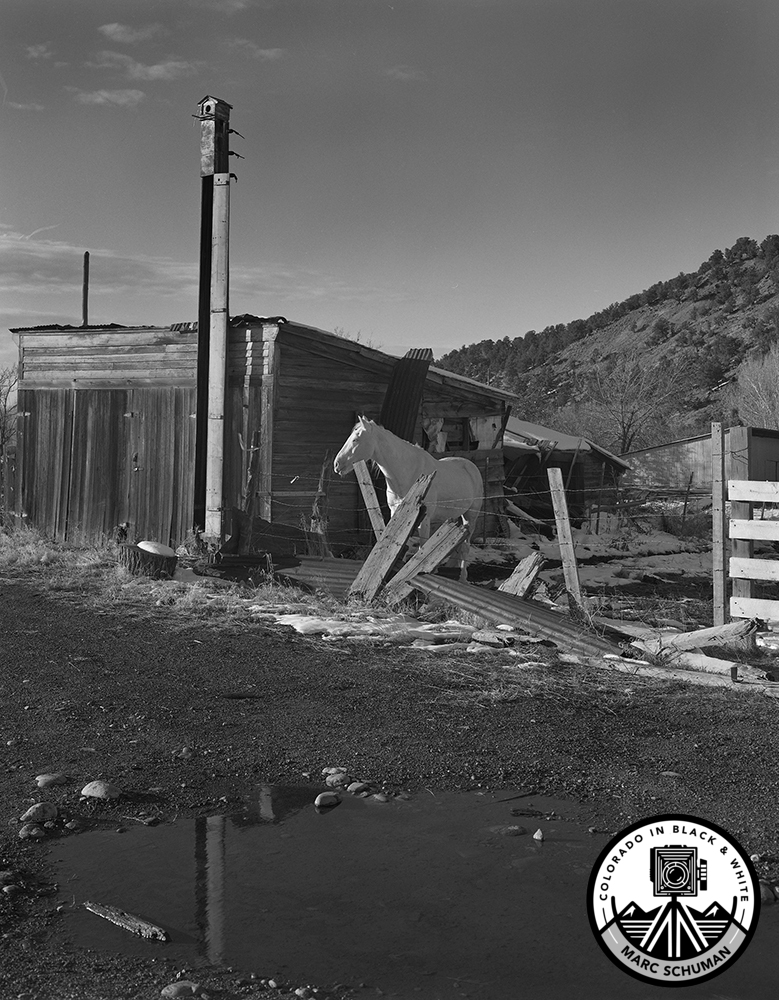 Emma, Colorado, lies between Basalt and Carbondale on State Highway 82 in the Roaring Fork River Valley in Western Colorado. Emma is just a place name. There is no town. However, a handsome abandoned red brick building stands in Emma close to the highway that served as a general store decades before my arrival in 1971. Next to the brick building was a white horse in a disheveled farmyard that caught my eye in the late October afternoon sun. Typical at the time were small farms up and down the Roaring Fork Valley that had been started by European immigrant families. I had no idea who owned this farm, but the strong lines in this scene contrasted with the white horse and grabbed my attention, resulting in this photograph on Kodak film with my 4×5 Calumet view camera equipped with a Schneider 90mm f8 Super Angulon wide angle lens. Strong compositional lines–a tall bird house, a rough sawn fence, an old barn, discarded lumber, corrugated sheet metal, among many other elements, all suggested a story of earlier times that descended to this scene of disrepair. The horse is oblivious to this disarray, staring instead toward the setting sun. Today the mid-Roaring Fork Valley bustles with development and gentrification, having long since swept away scenes such as this that captivated my interest more than fifty years ago.