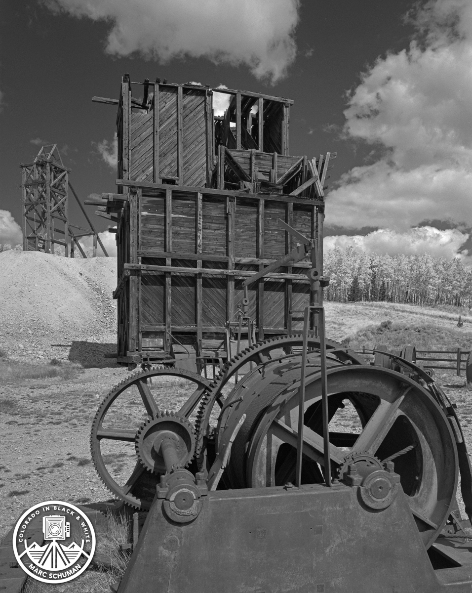 This vertical image of the Forest Queen Mine infrastructure was made on Kodak film using a 5×7 Linhof Technika with a 120mm f8 Nikkor SW wide angle lens. With the extreme depth of field of this lens, everything from the nearby windlass to the headframe in the distance is razor sharp.