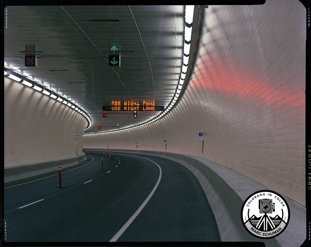 The 4000-foot-long Hanging Lake Tunnels are the crown jewel of the twelve-year-long I-70 construction project through Glenwood Canyon, just east of Glenwood Springs in western Colorado. Comprised of forty bridges and various elevated spans costing 500 million dollars, the completion of this twelve-mile stretch of I-70 along the Colorado River was the final piece of the interstate highway system in Colorado, as originally planned during the Eisenhower Administration in the mid-1950’s. Enormous engineering and environmental challenges defined this project which won wide-spread recognition for its design and construction innovations. The tunnels took a dangerous curve out of the original two-lane US 6 pathway. Image made far inside tunnel one day prior to the tunnels’ dedication using a 4×5 Wide Field Calumet view camera and a 90mm f5.6 Super Angulon lens on long-exposure Kodak color negative film. Sodium vapor lighting in the tunnels is vastly different in color temperature than daylight, requiring heavy magenta corrective filtration to reveal the true color of the more than three million ceramic tiles specially made in Germany for this project.