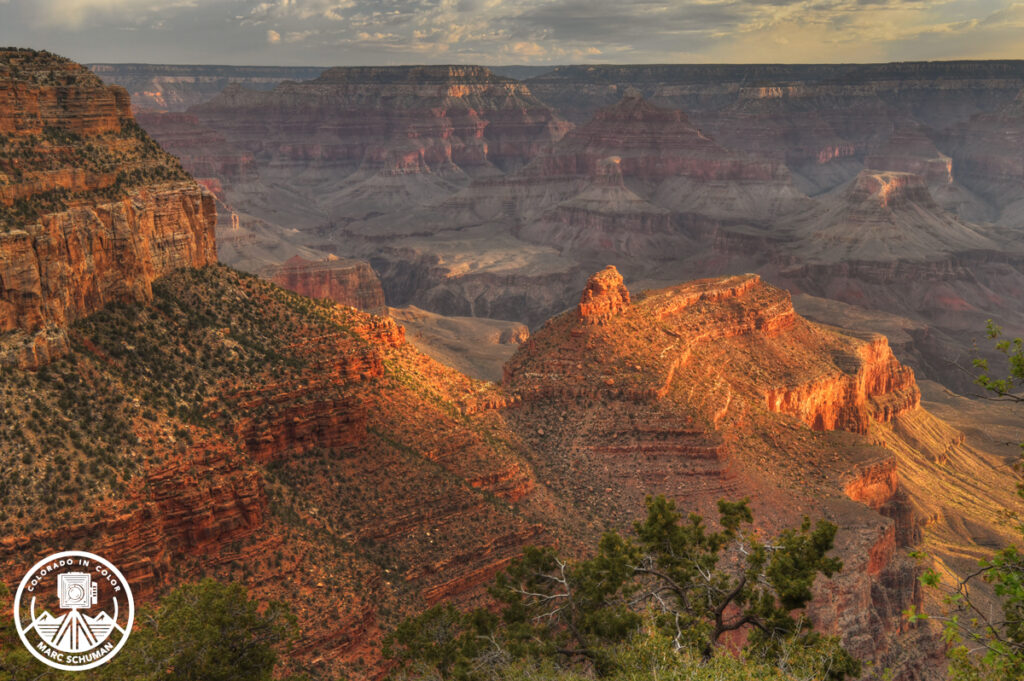 The Grand Canyon at Daybreak from the El-Tovar Hotel Overlook, June 7, 2024. When photographing the Grand Canyon, one quickly realizes that no ground-based position can capture the magnitude of this incomprehensively vast area.  One, instead, must isolate appealing elements and photograph them using early or late light to accentuate geographical features.  Flat, high light is generally to be avoided, as it generally fails to create any sense of depth. On only my second visit to the Grand Canyon, an early morning attempt to photograph this wonder seemed the best way to capture an impactful image.  Waiting for a moment when the rising sun broke through patchy clouds, my camera was positioned on a tripod ready to take this photograph.  The clouds softened the warm directional light and created a dappled effect on the foreground bluff–but only very briefly.  Canyon walls in the distance were just beginning to be cross-lit to reveal texture and contours by the same quality of light as in the foreground.  There is a strong suggestion of depth and great distance in this scene.  The foreground shadow at left draws the viewer’s eye into the composition. My Nikon D-850, equipped with a 24-70mm f2.8E ED Zoom Nikkor at 40mm focal length isolated only a miniscule fraction of the Grand Canyon’s magnitude, but I achieved what I had set out to accomplish.