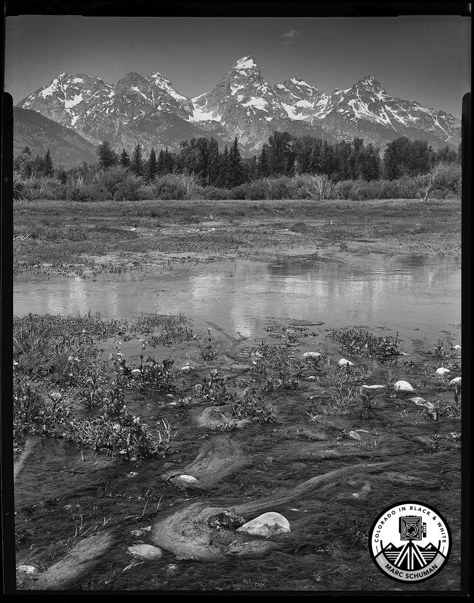 The Blacktail Ponds run along the Snake River east of the Grand Teton range, creating wetlands that support a vast riparian ecosystem. This image was made with a 150mm f5.6 Schneider Symmar lens on a 4×5 Calumet View Camera using Kodak black and white film.