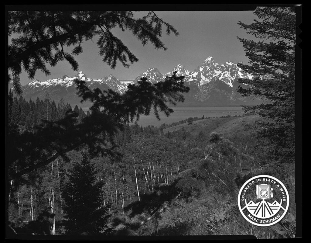 What grabbed my attention as a photographer exploring this less traveled area, was the juxtaposition of the Tetons with the upper boughs of a stately conifer, which seemed to perfectly point to five of the peaks in this majestic range. The lower branch points to three of the same peaks from below.