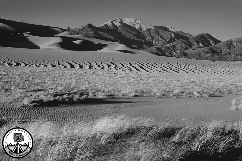 A scene of stark geological and visual contrast on a windswept November late afternoon, this digital image captured with a Pentax KIII Monochrome camera equipped with a 24-70mm f2.8 lens shows an expanse of the Great San Dunes and the Sangre de Cristo Mountains beyond. Prints of this scene will be ink jet, as this is an image captured digitally.