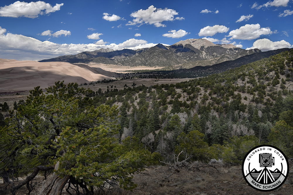 Cumulonimbus clouds dot the sky over the eastern end of the Great Sand Dunes and Mt. Herard in this image taken from Overlook Trail. A momentary cloud over camera position allowed the sun to highlight the distant scene. Taken with a Nikon D850 DSLR using a 24-70mm f2.8E ED Nikkor lens at 31mm.