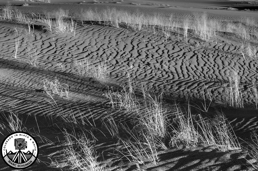 At last directional light, grasses contrast strongly with wind-driven sand in Medano Creek dry bed. Digital image captured with a Pentax KIII Monochrome camera equipped with a 24-70mm f2.8 lens. Prints of this scene will be ink jet, as this is an image captured digitally.