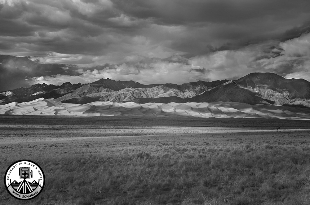 Clouds, sunlight, and shadows take on unworldly tonality in this digital infrared image of the Great Sand Dunes on an unusually warm and windy day. Taken with a special infrared modified Nikon D800 using a 24-70mm f2.8E ED Nikkor lens at 58mm focal length. Because this image was captured digitally, high quality inkjet prints are available.