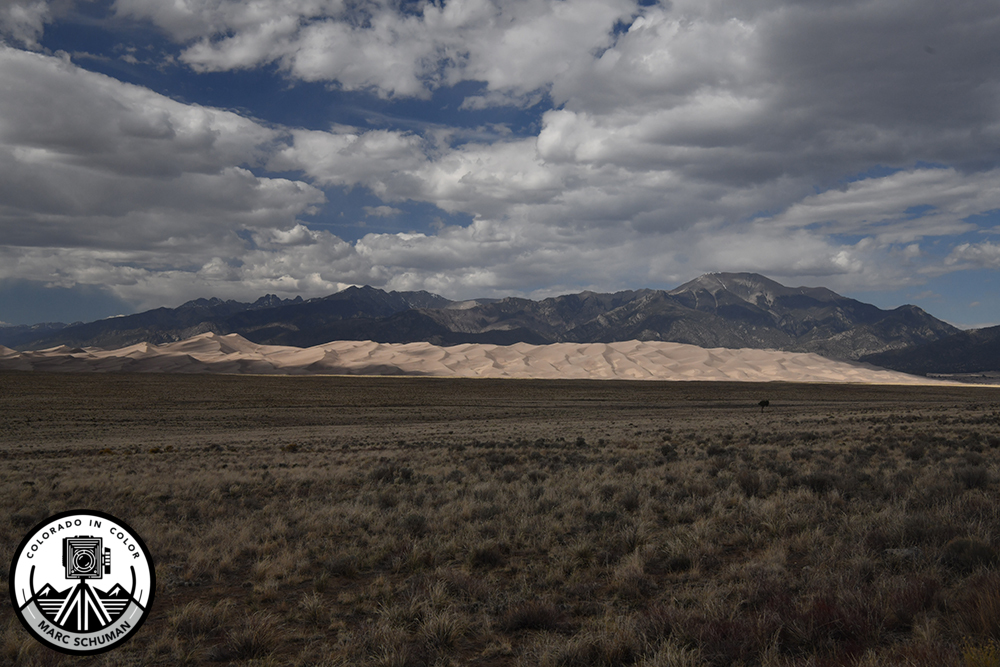 As if by design, the Great Sand Dunes are spotlighted by a momentary shaft of sunlight, leaving the Sangre de Cristo Mountains as a darker backdrop. At the same moment the San Luis Valley floor falls in another vast shadow. Taken with a Nikon D850 using a 24-75mm f2.8E ED Nikkor lens at 45mm.