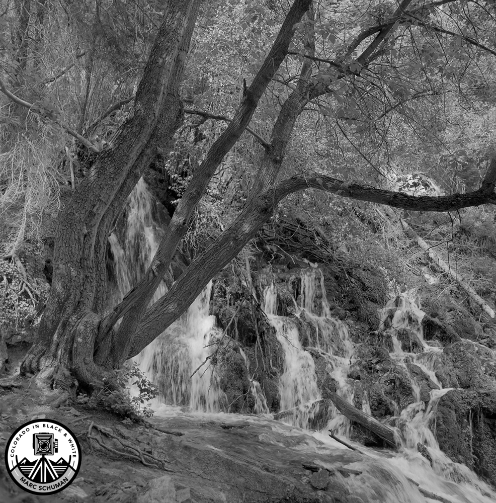 “Once upon a time in a place far far away,” so the saying goes, the hiking trail from the gravel parking lot adjacent to old two-lane Hiway 6 in Glenwood Canyon to delicate Hanging Lake in a side-canyon to the north was a rugged thousand-foot vertical rise in about a mile and a quarter. No reservations were needed. One could simply drive to the parking lot and begin the hike at a time of one’s choosing. No more. With the completion of its eponymous tunnels and the four-lane I-70 roadway through Glenwood Canyon in 1992, hiking traffic increased many-fold over the ensuing years, requiring reservations days in advance. Over-use of the primitive trail, which remains substantially the same as it’s always been, has necessitated tight controls on the volume of hikers allowed to make the climb in order to preserve the lake’s fragile ecology. In recent years a disastrous fire throughout much of Glenwood Canyon threatened Hanging Lake’s very existence, but the area was spared. A visit to this lake continues as one of the most scenic and accessible hikes in Colorado. Image made on Kodak black and white film with a Rolleiflex 2.8F medium format camera equipped with a Carl Zeiss 80mm f2.8 Planar lens.