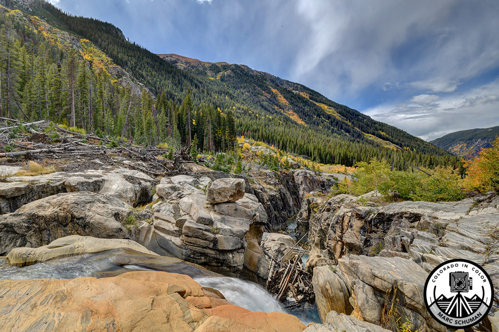 A tributary of the Roaring Fork River with headwaters on Independence Pass above Aspen, Colorado, Lincoln Creek runs 9500 feet above sea level. Over the course of millennia this particular waterfall on Lincoln Creek has cut a deep chasm through bedrock, depositing tree trunks and other material at the bottom of the falls. To the right of image center the creek is seen in a narrows before flowing onward, eventually emptying into the Roaring Fork River. Dispersed overnight camping is permitted along Lincoln Creek in designated sites. Shortly after taking this photograph a rapidly moving thunderstorm rolled in making further photography impossible. A Nikon D850 equipped with a Nikkor 16-35mm Zoom lens at 16mm was used to make this image.