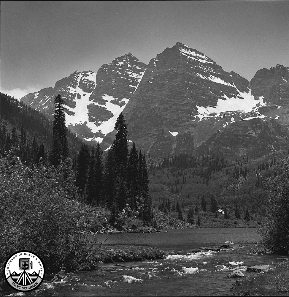 Notable in this photograph of the Maroon Bells is the tonality of the mountains themselves–largely composed of shale, which becomes dangerously slippery when wet–“The Deadly Bells,” as one trailhead sign warns. There is a certain rich iridescent tone to the rock in these towering peaks which suggests their shale composition. This view from the point of Maroon Lake that feeds Maroon Creek was taken with a Hasselblad 500 C medium format camera equipped with a 120mm f5.6 Carl Zeiss S-Planar lens and Kodak film. The 120mm lens, being moderately telephoto on a medium format camera intensifies the visual impact of these massive mountains.