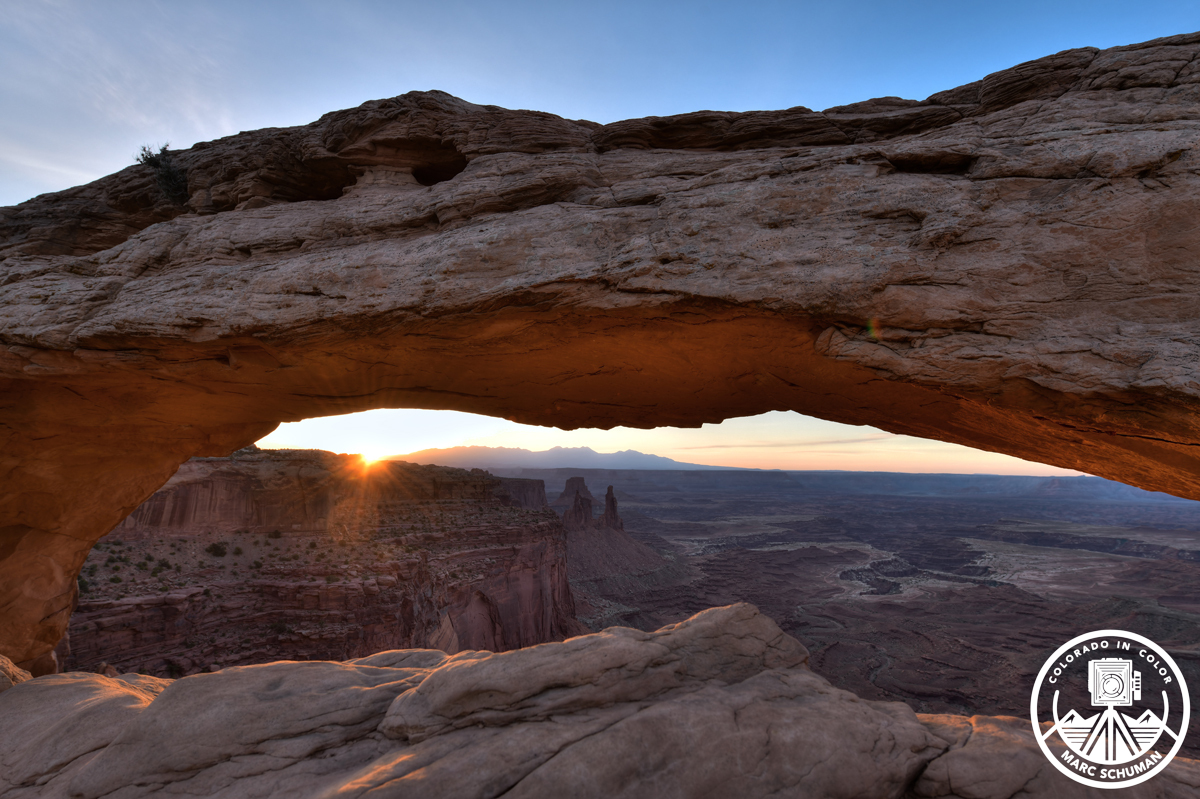 The Lasal Mountains lie in the distance beyond Canyonlands National Park. Mesa Arch frames the scene of nearby canyons and buttes.