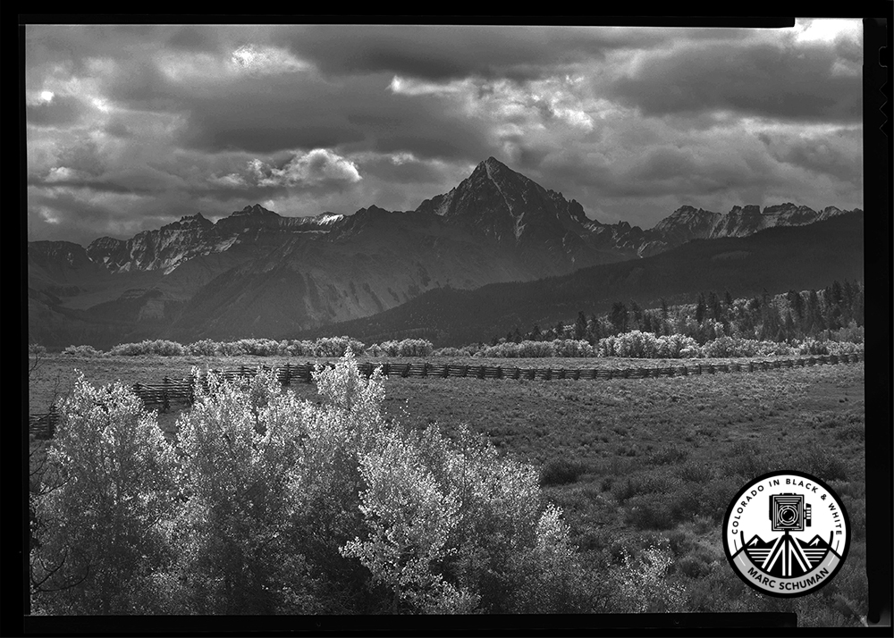The famed Double RL Ranch split rail fence and aspens at their peak fall intensity form the foreground for this dramatic image of Mt. Sneffels on a cloud-filled afternoon. Taken with a 450mm f9 Nikkor Lens on a 5×7 Linhof Technica field camera using Kodak film.