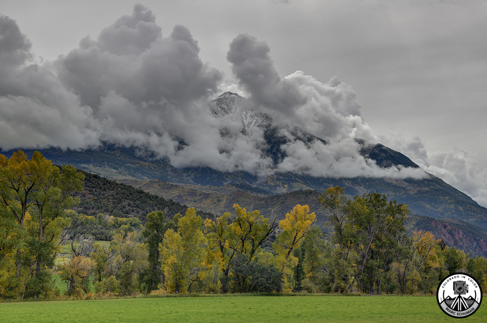 Clouds part to highlight the northern peak of twin-peak Mt. Sopris, as the first dusting of snow of the season is revealed on the upper slopes. Cottonwoods along the Crystal River in the foreground are subtly backlit revealing their vivid fall foliage. This image was made with a Nikon D850 equipped with a 24-70mm f2.8 Nikkor Zoom Lens at 70mm focal length.