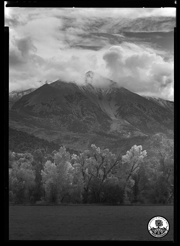 For less than thirty seconds in a two-and-one-half hour time span, clouds parted to highlight the northern peak of twin-peak Mt. Sopris, as the first dusting of snow of the season is revealed on the upper slopes. I was able to expose only one negative as a result of the slow retreat of this storm. This day would ultimately prove to be more fruitful photographically, but not here in the early afternoon. I was extremely lucky that my exposure and development of the single 5×7 negative was accurate. Cottonwoods along the Crystal River in the foreground are subtly backlit revealing their vivid fall foliage. This image was made with a 450mm f9 Nikkor lens on a 5×7 Stenopeika camera using Kodak film.