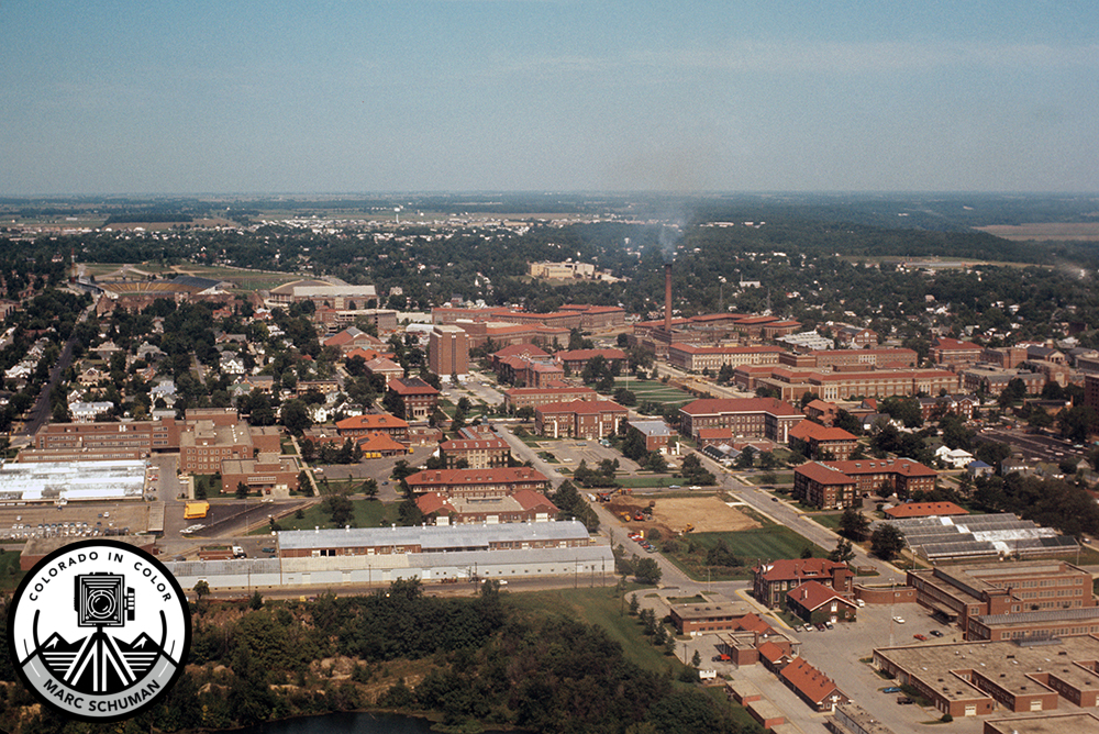 With its distinctive red brick/red tile roof architecture, Purdue’s West Lafayette campus is on full display in this aerial photograph looking northeast from a position above the southwest portion of the agriculture campus. Notable is the landmark power plant smokestack at center right. Purdue had its own railroad switch engines which brought coal loaded gondolas on a rail spur to the power plant in the middle of campus. Years later, the power plant and smokestack were razed. The campus is now dominated by the 160-foot Purdue Bell Tower. At the time of this photograph, ninety-nine years from its founding, Purdue was a world renown engineering and agriculture university. with an enrollment of 18,000. Almost every engineering discipline had its own building. More than fifty years later, Purdue has grown to 50,000 students with expanded programs in many other fields of learning. Indiana’s legislature has avoided duplication of many graduate programs in its state universities, leaving Purdue devoid of architecture, law, medicine, optometry, and music schools, to name a few. Purdue’s sister state university and arch-rival–Indiana University at Bloomington, offers degrees in the aforementioned programs. Nonetheless Purdue has continued to earn world-wide recognition in expanding areas of research and technology. Taken with a 35mm Yashica J-5 SLR equipped with a 50mm Yashinon lens on Kodak color negative film.