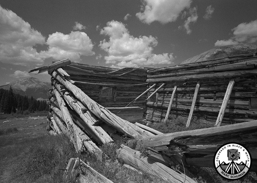 14, 271-foot Quandary Peak is identified by a log fragment atop an old mining cabin wall at Mayflower Gulch. Taken with a Plaubel Pro-Shift Medium format camera on Kodak film, the 47mm f5.6 Schneider Super Angulon wide angle lens permanently mounted on this camera has superbly rendered every detail in this image.