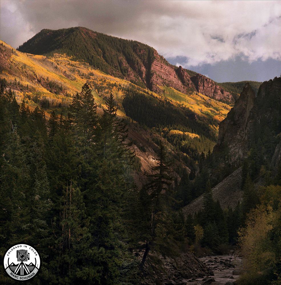 Late afternoon sunlight illuminates vast stands of golden aspen just below the Redstone Cliffs, a hallmark of the upper Crystal River Valley. Captured on Kodak medium format color negative film using a Hasselblad 500C equipped with a Carl Zeiss 100mm f3.5 Planar lens.