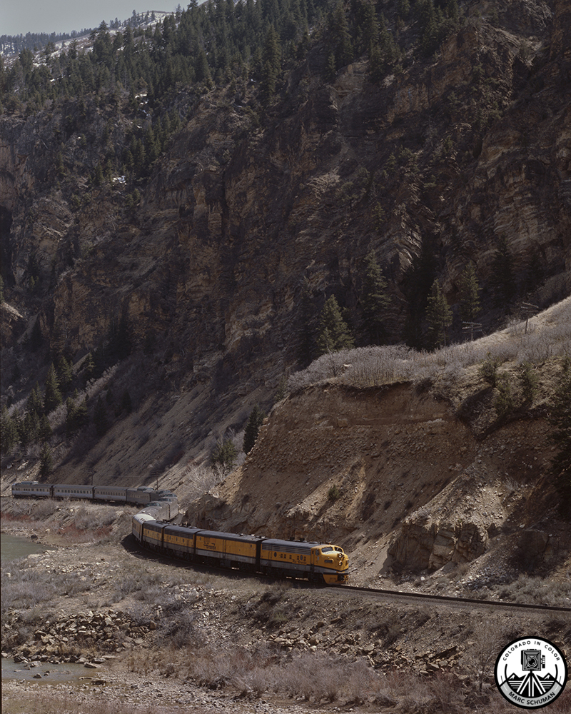 Rio Grande Zephyr at Noname in Glenwood Canyon, nr. Glenwood Springs, Colorado, April, 1983