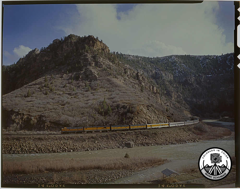 Horseshoe Bend, immediately east of Glenwood Springs is the beginning of Glenwood Canyon, which stretches eastward for approximately 17 miles. Through Glenwood Canyon in 1983 ran the Colorado River, the Denver and Rio Grande Railroad (now the Union Pacific Railroad), and US Highway 6. By the end of April, 1983, the Zephyr had made its last run, replaced by Amtrak. In this view taken on Kodak transparency film with a Calumet View Camera and either a 90mm f5.6 Super Angulon or a 150mm f5.6 Symmar lens (my records are unclear), the Colorado River flows downstream from left to right while the train is headed upstream from right to left. Construction was well underway on the massive I-70 four-lane project in Glenwood Canyon on the north side of the river, which used nearly all of the US 6 right-of-way. The railroad tracks, constructed in the 19th Century on the south side of the river, were virtually untouched by the highway construction.