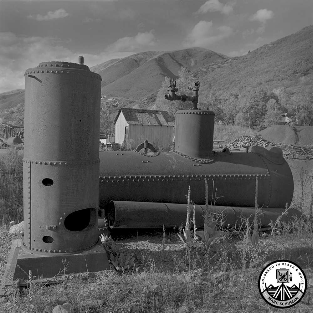 The largest silver nugget ever mined, weighing nearly one ton, came from the Smuggler in 1894. With the repeal of the Sherman Silver Purchase Act in 1893, most mines in Colorado closed, but the Smuggler continued production off and on to the present day. Not surprisingly tours of the mine bring in more income than current silver production. Though the exact purpose of the abandoned tank in this image is unknown it had several likely uses, as water and fuel are needed in most mining operations then and now. The large number of preserved wooden structures at this site provides numerous photographic opportunities. Taken on Kodak film with a Hasselblad Super Wide medium format camera.