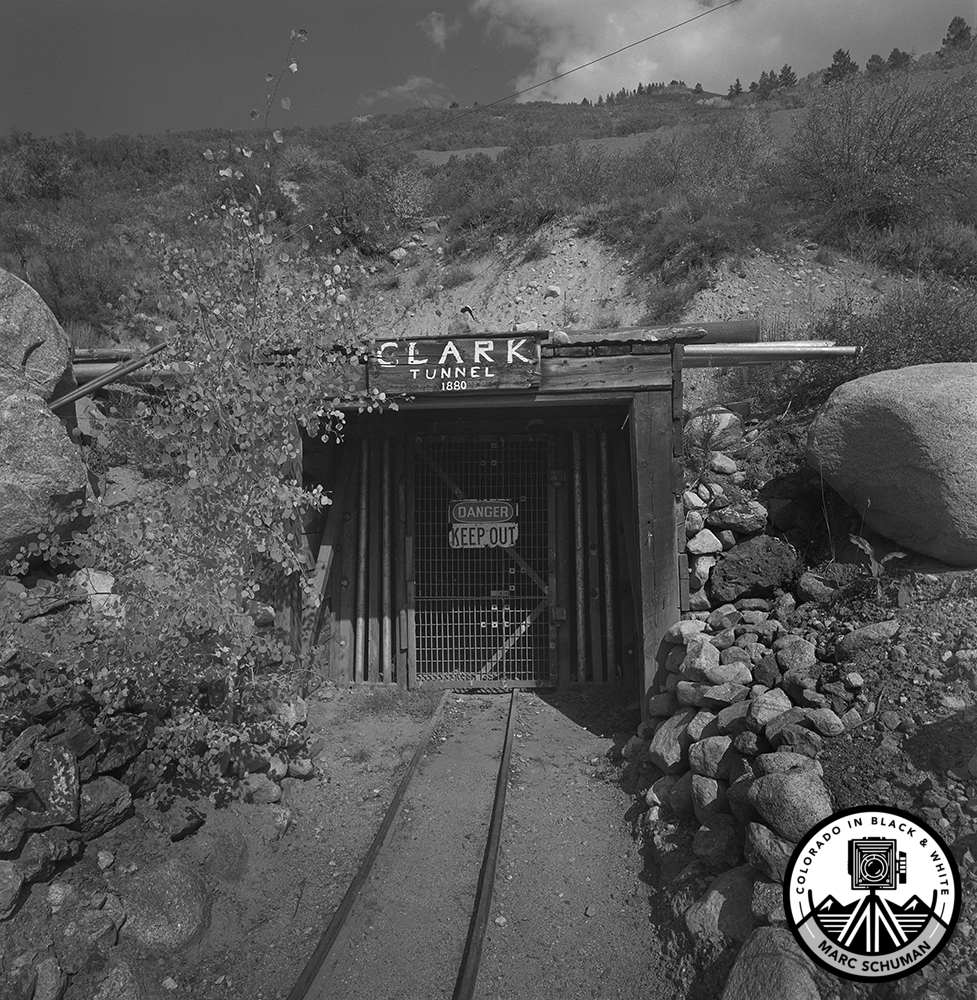 The largest silver nugget ever mined, weighing nearly one ton, came from the Smuggler in 1894. With the repeal of the Sherman Silver Purchase Act in 1893, most mines in Colorado closed, but the Smuggler continued production off and on to the present day. Not surprisingly tours of the mine bring in more income than current silver production. Seen here is the view of the Clark Tunnel portal of the Smuggler Mine. The large number of preserved wooden structures at this site provides numerous photographic opportunities. Taken on Kodak film with a Hasselblad Superwide medium format camera.