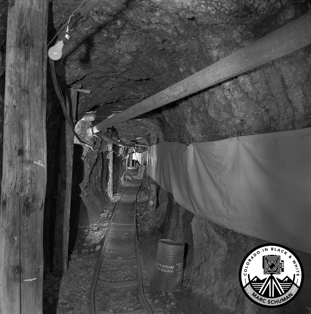 The largest silver nugget ever mined, weighing nearly one ton, came from the Smuggler in 1894. With the repeal of the Sherman Silver Purchase Act in 1893, most mines in Colorado closed, but the Smuggler continued production off and on to the present day. Not surprisingly tours of the mine bring in more income than current silver production. Seen here is the view of the Smuggler main horizontal “drift” with drainage pipe above and “brattice” PVC curtain for ventilation at right leading into the depths of the mine. The large number of preserved wooden structures at this site provides numerous photographic opportunities. Taken on Kodak film with a Hasselblad Superwide medium format camera.