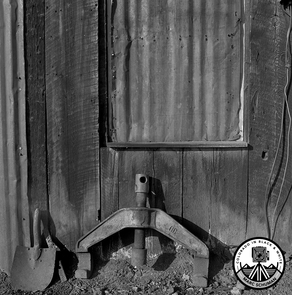 The largest silver nugget ever mined, weighing nearly one ton, came from the Smuggler in 1894. With the repeal of the Sherman Silver Purchase Act in 1893, most mines in Colorado closed, but the Smuggler continued production off and on to the present day. Not surprisingly tours of the mine bring in more income than current silver production. Late afternoon light provides the perfect illumination for old tools and rough-sawn lumber to take on character and texture otherwise overlooked. The large number of preserved wooden structures at this site provides numerous photographic opportunities. Taken on Kodak film with a Hasselblad 500C medium format camera equipped with an 80mm Carl Zeiss Planar lens.