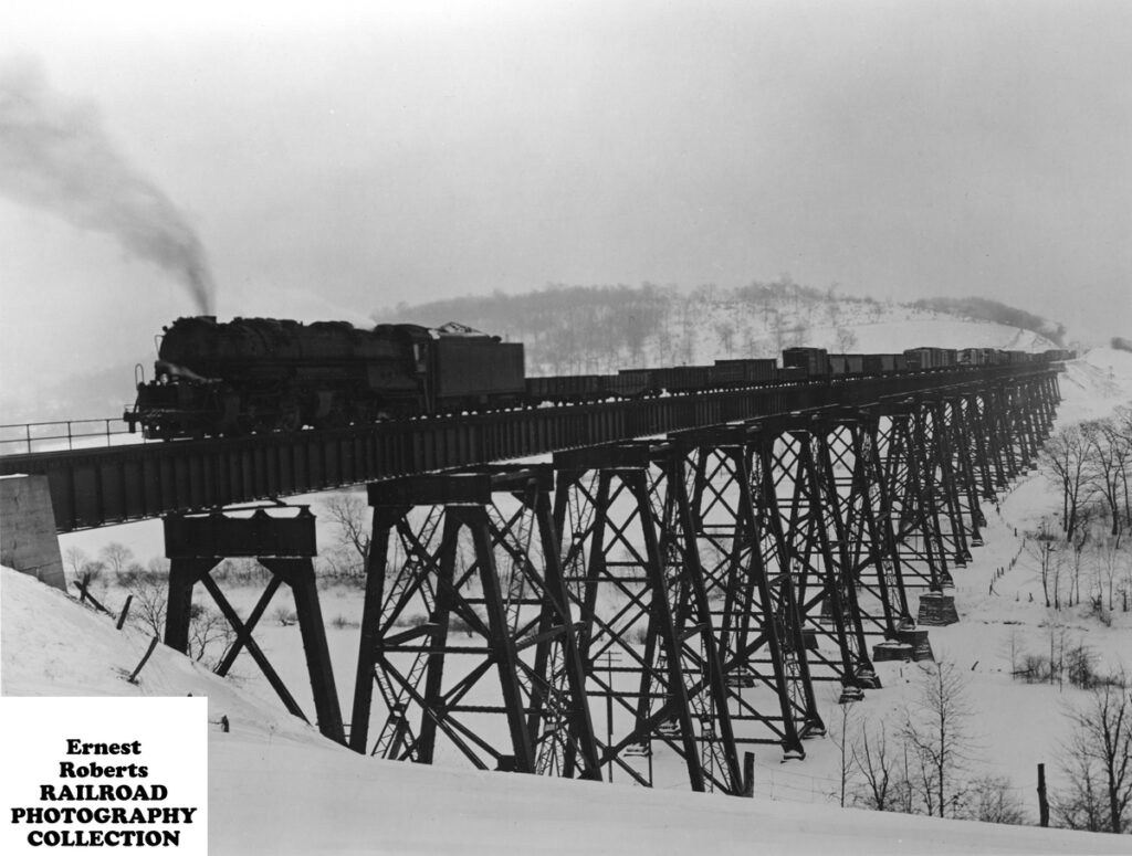 Nothing of the provenance of this image is known.  Yet it represents in the early twentieth century of America much of the sophisticated railroad engineering occurring in this country.  Old wooden trestles, hastily erected to advance trackage across the country were being replaced with far more permanent steel pier trestles, capable of holding the weight of thousands of tons of freight-laden railcars.  This image clearly shows that adverse weather was mostly a minor nuisance to railroad operations and that a newly built steel trestle could easily carry the weight of a long heavy freight drag consisting of gondolas, boxcars, and hoppers.