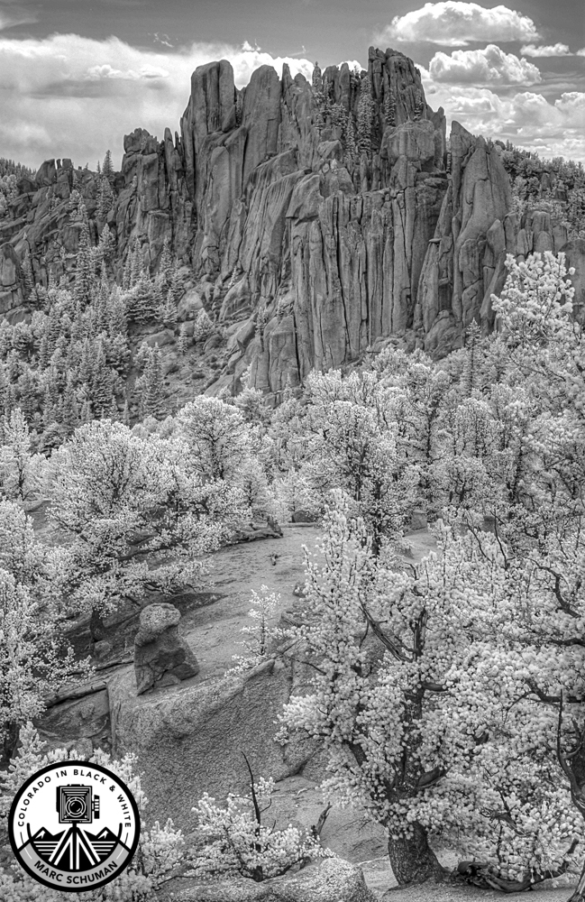 Taken with a specially infrared modified Nikon D1x DSLR equipped with a 20-35mm f2.8 Nikkor Zoom lens set at 35mm. The Craggs takes on unworldly dimensions of tonality and character far different than those in conventional black and white digital photography. A hike to The Craggs features a variety of terrain found in the foothills of Pikes Peak, and is one of many interesting destinations for hikers in the Colorado Springs area. Fine art digital prints of this image and many other landscape and general interest subjects are available for purchase at coloradoinblackandwhite.com.