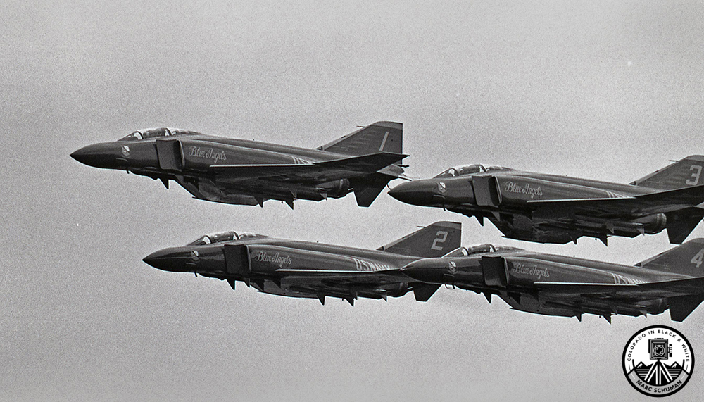 F4 Phantom solo planes numbers one through four are seen here over the Purdue University campus in a May 1969 air show. Nearly sixty years ago F4’s were the front-line supersonic interceptor/fighter/bombers of the US Navy. Eventually used by the Marine Corps and Air Force as well, more than five thousand of these venerable aircraft were produced. No other American jet fighter has been produced in such large numbers. Image was made with a Yashica J-5 SLR fitted with a manual focus Yashinon 75-230mm f4.5 Zoom lens at 230mm using Kodak black and white film. Due to their high prices motor-driven 35mm SLR’s were the tools of professional photographers in 1969, and their firing rates were just two to four frames per second–primitive compared to today’s mirrorless cameras and professional DSLR’s. Auto-focus lenses were fifteen years into the future. Of the images made that day on a single thirty-six exposure roll of film, only one or two frames were successful.