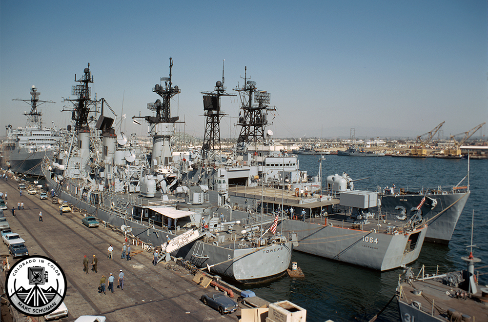 My last day of active duty in the US Navy was 3 September 1971. Before I departed the USS Blue Ridge (LCC-19), I made two photographs from the bow of my ship to show the busy 32nd Street Naval Base in San Diego and the Pacific Fleet ships in port. Two photographs were required. In this first image, the three ships tied abreast from the pier outward are USS Towers (DDG-9), USS Lockwood (FF-1064), and USS Parsons (DDG-33). In the distance is USS Denver (LPD-9). In the lower right foreground is the fantail of USS Decatur (DDG-31). These ships no longer exist. Four were sunk as targets, and one was scrapped. And the ship upon which I was standing to make this image–the USS Blue Ridge? It is now the flagship of the US Seventh Fleet–the oldest ship still in active service in the United States Navy, (save for the USS Constitution in Boston). I get chills thinking about the ships and personnel now gone that were so familiar to me more than fifty years ago… Image made with a Yashica TL Electro-X with a 50mm f1.8 normal lens on Kodachrome film. A high-resolution digital scan was made of this slide for purposes of printing.