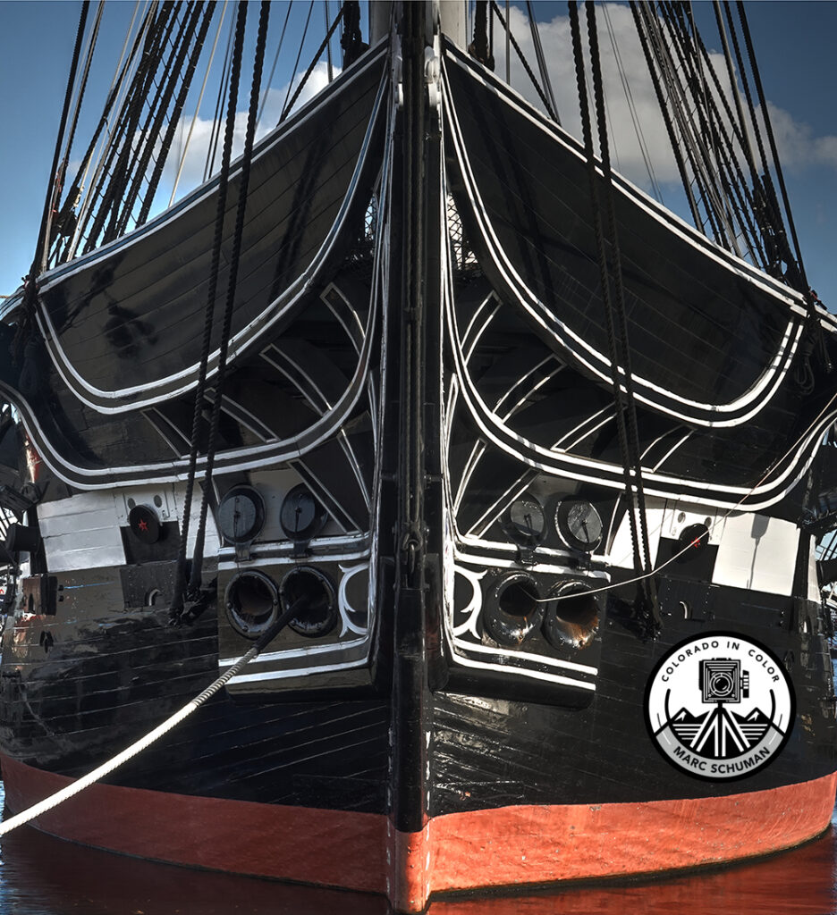 The oldest warship in active service in the US Navy and the oldest warship afloat in the world, the USS Constitution was commissioned in 1797 as one of six square-rigged 44-gun frigates in the original order of capital ships for the US Navy. It is popularly believed that this storied vessel fought in the American Revolutionary War, but the colonies had no navy during that conflict. Rather the ship was ordered and built to protect American merchant vessels during the quasi-war with France and to fend off the Barbary pirates along the north coast of Africa who were exacting tribute from American vessels in exchange for safe passage in the Mediterranean. During the War of 1812, this sturdy man-of-war captured five British ships and earned its nickname, “Old Ironsides,” when enemy cannon balls bounced off her sturdy live-oak sides. Constitution sailed as the flagship of the US Navy Mediterranean and African squadrons well into the mid-nineteenth century. Today, active-duty US Navy officers and enlisted personnel in period uniforms give tours of Constitution and maintain this historic vessel. This bow-on view of gunports, hawse pipes, and ornate paint work was taken with a Sony RX-10 IV digital camera.