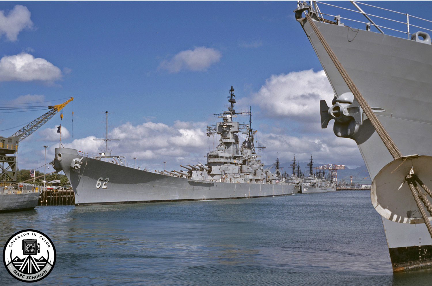 USS New Jersey (BB-62) framed by bow of USS England (DLG-22), Pearl Harbor, Hawaii, July, 1969. As a midshipman during my summer training cruise in 1969, I had many photographic opportunities, but few like this scene at Pearl Harbor, Hawaii. The ship in which I served, USS Morton (DD-948), is barely visible in the center of the nest of three destroyers tied up astern of New Jersey. One of the four Iowa Class battleships, the New Jersey is a piece of WWII naval history like few other vessels, having served as Fleet Admiral William F. Halsey’s flagship at the Battle of Leyte Gulf, the last major naval action of WWII. Perhaps, only New Jersey’s sister-ship, USS Missouri (BB-63), now a permanent memorial at Pearl Harbor, is better known as the site of Japan’s surrender at the end of WWII in Tokyo Bay. Taken with a Rollei 35T 35mm camera on Kodachrome 25 Color Slide Film, a high resolution digital scan of the original generates excellent enlargements.